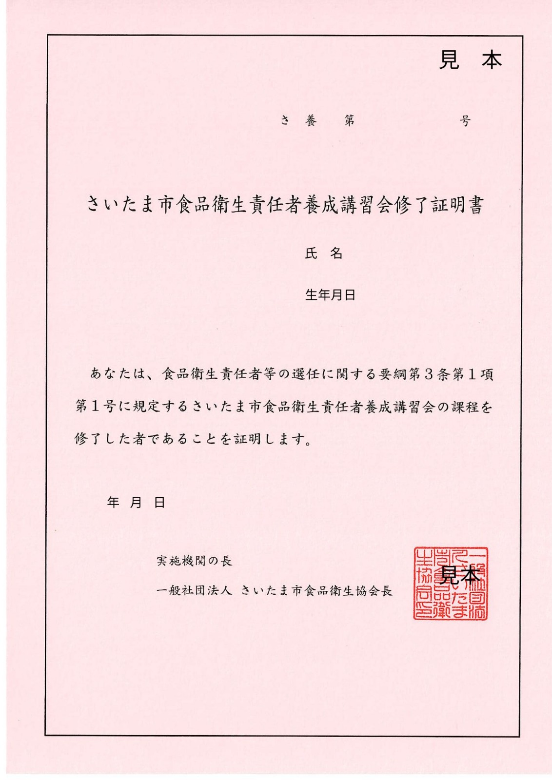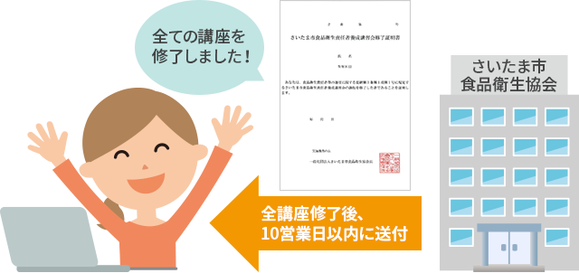 受講修了者には、「食品衛生責任者養成講習会 受講修了証明書」を一般社団法人さいたま市食品衛生協会から発行します。
